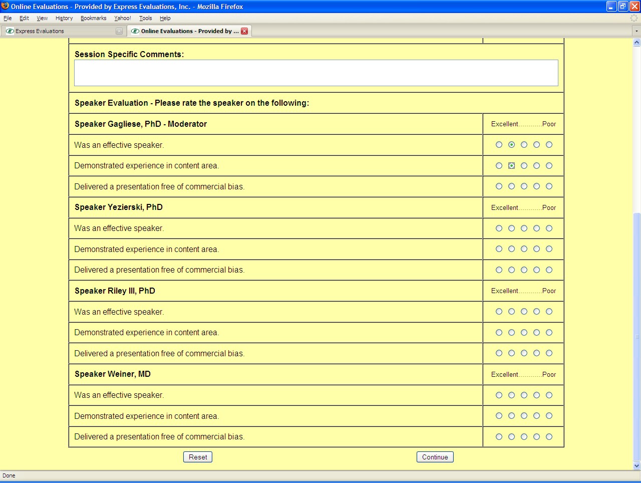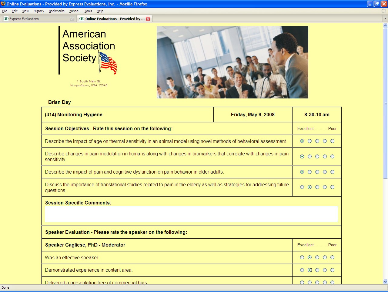 Speaker/Presenter objectives and disclosures - Speaker names and disclosures can be included with their evaluation criteria. Normally, speakers are evaluated against a standard set of objectives. This allows for a ranking of speakers amongst their peers (see Speaker Ranking Report). |